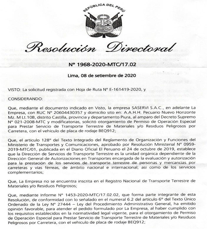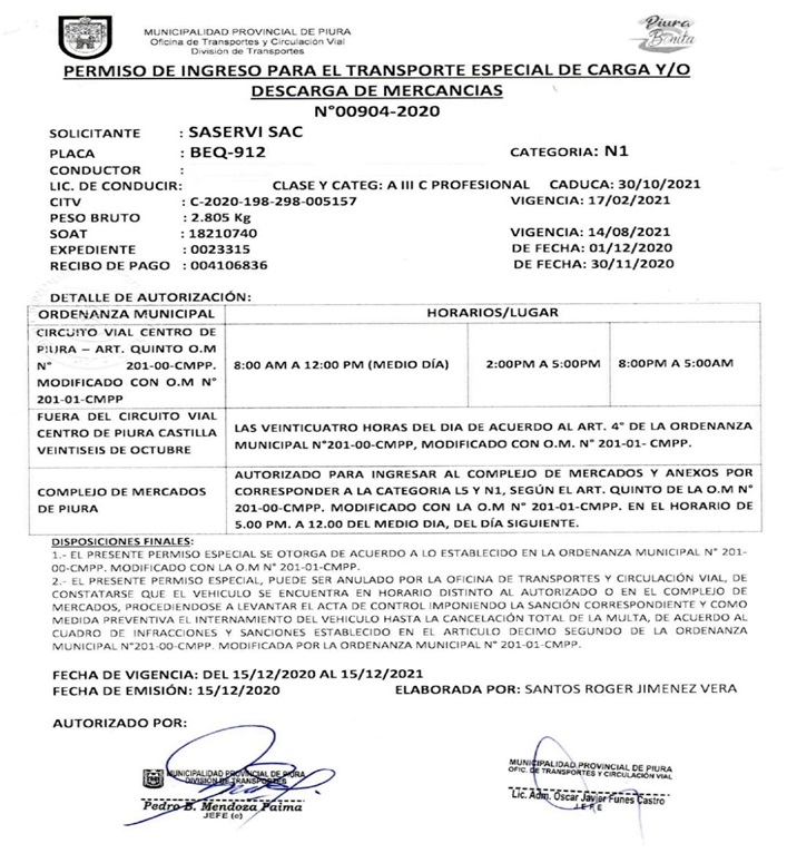 PERMISO DE INGRESO PARA LA CIUDAD DE PIURA