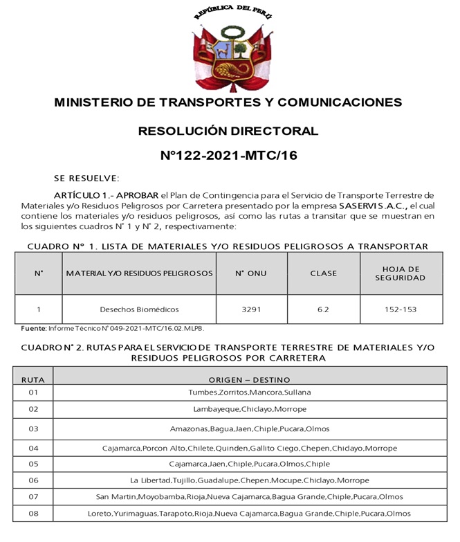 RESOLUCION DIRECTORAL DEL PLAN DE CONTINGENCIA - MTC